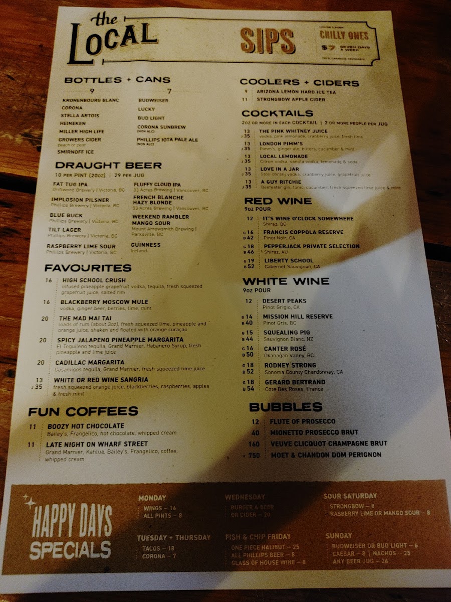 Welcome to The Local - Victoria, a vibrant dining destination nestled at 1205 Wharf St, Victoria, BC. This establishment is a culinary gem that combines a lively atmosphere with a diverse menu, perfect for both lunch and dinner. Delight in their comforting Roasted Garlic & Tomato Bisque, best enjoyed with a chunk of garlic bread for just CA$14.00, or indulge in a hearty Souvlaki Salad Bowl featuring marinated chicken and fresh veggies for CA$24.00.